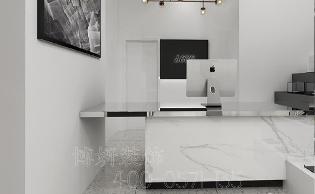 这是一家奢侈品店装修设计效果图。整体采用简约大气的装修手法,使顾客感觉到店铺的贵气。收银台装修设计的非常精美,白色系的大理石纹,桌面上使用黑色的大理石,整体装修设计实用性也非常强。