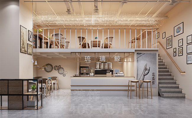 这是一家奶茶店装修设计案例。整体采用时尚简约的装修设计手法,这家奶茶店分为上下两层,上面专门是供顾客等候休息的。下面是制作奶茶的地方,整家店是采用浅色的装修色调,非常的令人舒适。