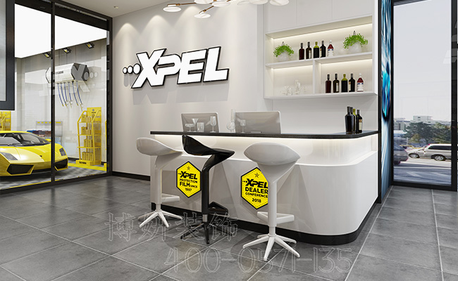 这是汽车美容中心的前台的设计,非常的大气、时尚。背后的柜子设计更是增加了亮点,放上几盆绿植再加上几瓶酒的摆放,也是大大增加生动、灵活性。