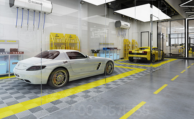 这是洗车的区域,整体采用透明的玻璃窗作为隔断,看上去干净又会显得空间大,地面上也做了不同的装修设计,漏水设计更加完善。